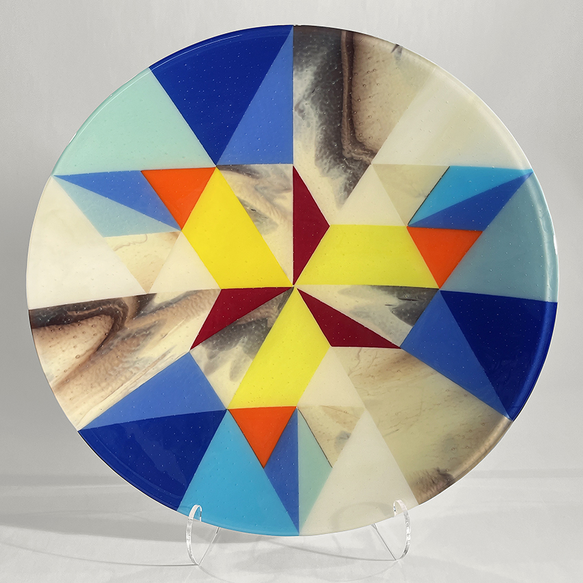 Original 16” x 16” kiln-formed glass artwork entitled “Every Which Way” was designed and hand made by Portland, Oregon artist David Haberer in 2024. This unique geometric was designed using 9 colors of Bullseye glass. The streaky glass accents are carefully placed to enhance the triangular geometries. It is slumped into a shallow bowl shape.