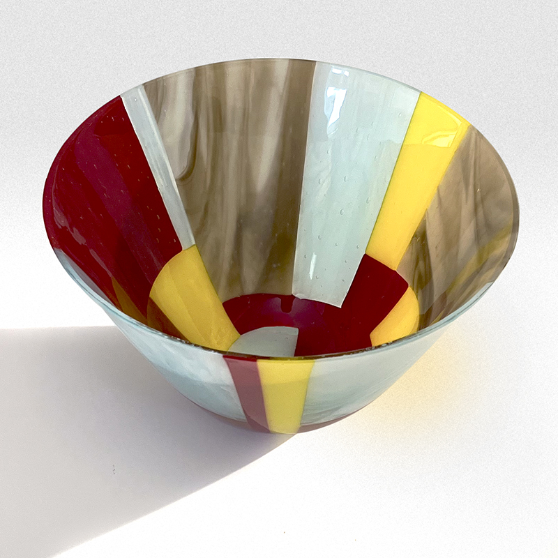This delicate vase uses the drop out technique to achieve a taller shape that is shiny on both sides. What starts as a concentric circle design becomes a soft curving element. The different glass viscosities also add a subtle relief between colors. A peek at the bottom shows a little pac-man shape which provides it’s name!