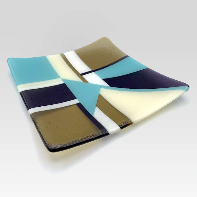 While these are not the typical primary colors of a Mondrian composition, I still named it “Mondo One” as he is inspirational artist for my work. The light bronze transparent glass appears golden and is constantly changing with the light. The deep amethyst is also translucent. One of my favorite early works.