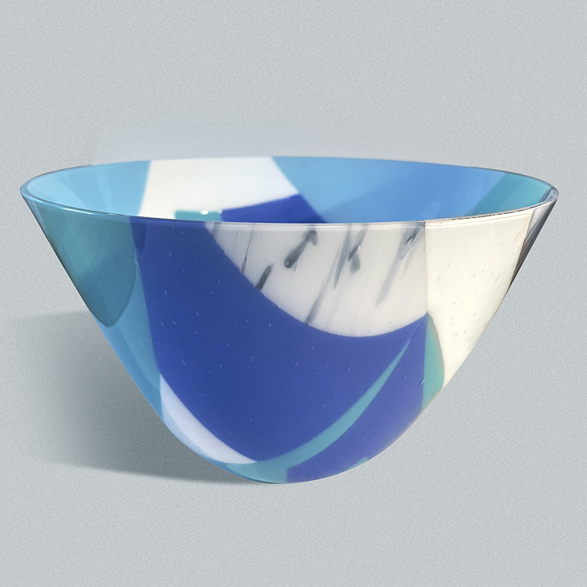 This deep vase uses the dropout technique to create a taller shape. The blue, white and teal colors have an ever changing translucence as the light changes — from soft and subtle to crisp and bold. I plan to create a shallower version to show off the unique geometric design.